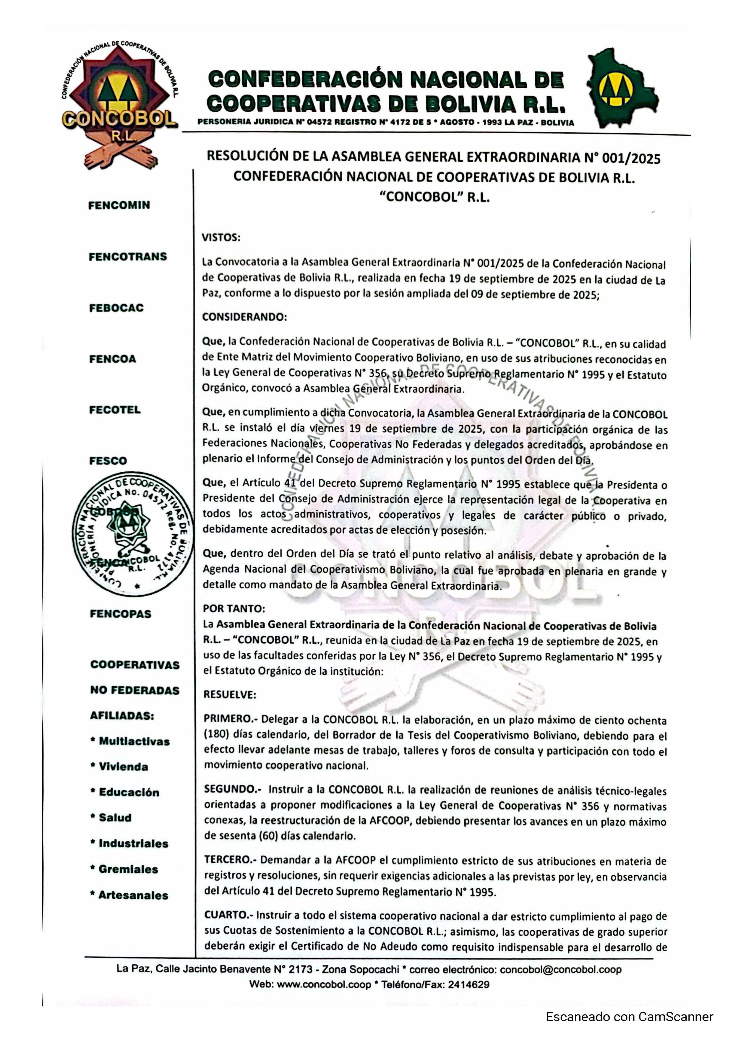 En asamblea realizada en fecha 18 de julio de 2025 en predios de la Cooperativad...